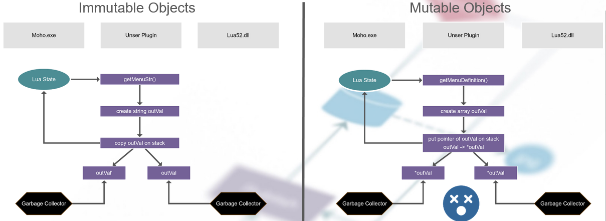 The reason is, that we shipped our own Lua52.dll. And that caused issues with mutable objects:
